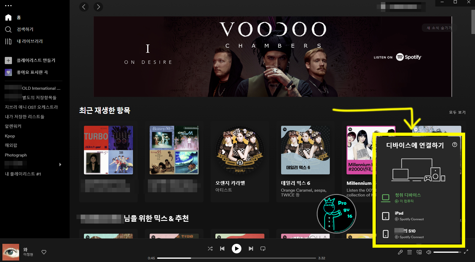 아래 사진에 노란색 박스로 되어있는 부분에서 Spotify Connect로 연결할 디바이스 선택이 가능합니다. 당연히 스포티파이에 연결한 기기들은 연결하기 전에 먼저 스포티파이 앱을 실행시켜 주어야합니다. (Mac: App store / Windows: Microsoft Store에서 Spotify 다운로드 가능)