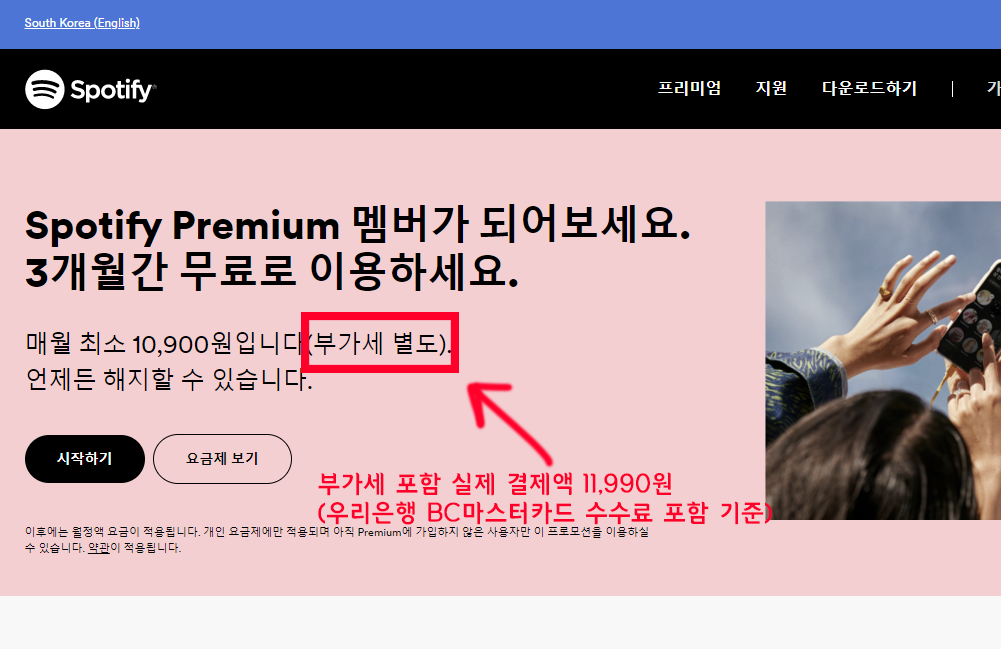 보통은 세금 포함금액으로 사이트에 기재를 해놓거나 세전금액 및 세후금액을 같이 기재해놓아서 혼동하지 않도록 해줍니다만 스포티파이는 세전금액만 적어놓고 실제로는 VAT까지 부과해서 처음 이용시 결제금액 보고 놀랐습니다.