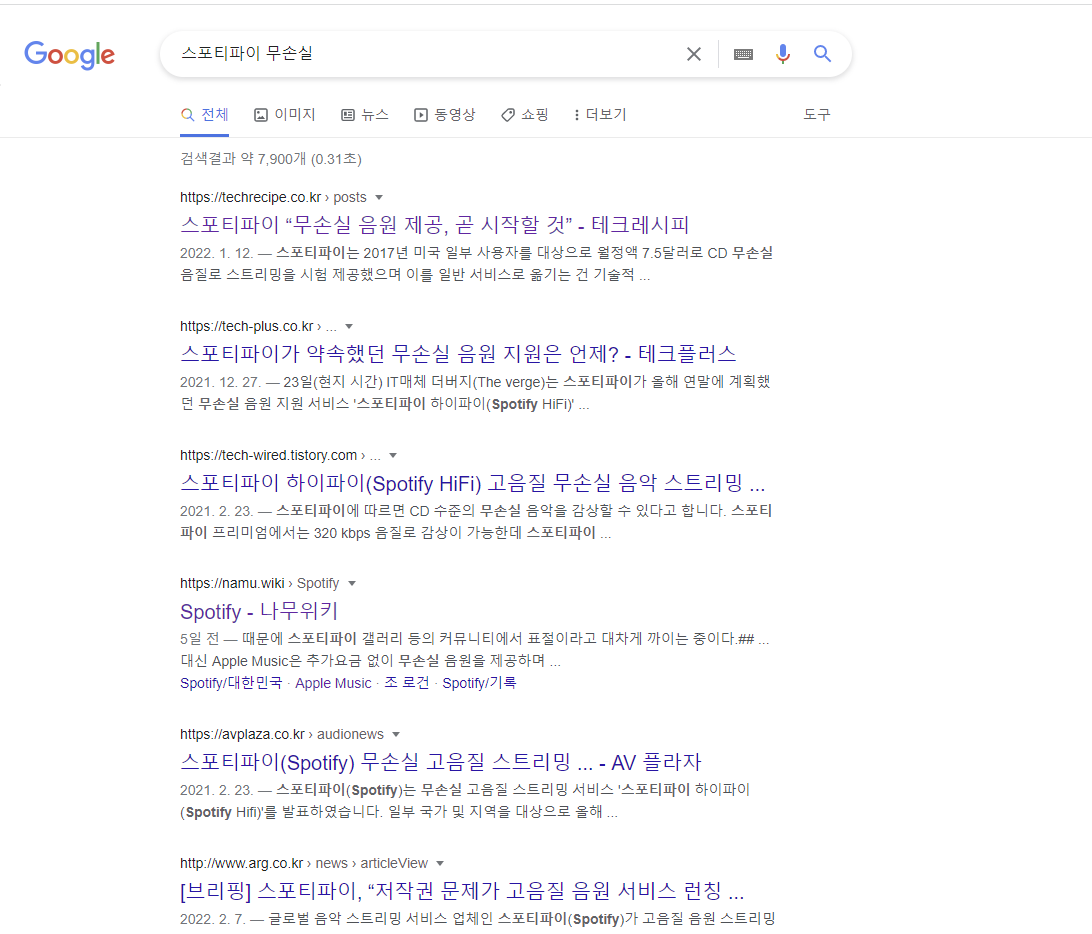 스포티파이는 전세계 1위 음원 서비스라서 당연히 무손실 음원이 있을 줄 알았습니다. 하지만 검색과 Flac 무손실 음원 요금제가 없는 것을 보고 알게 되었습니다.