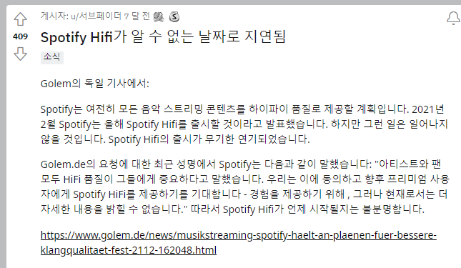 물론 스포티파이 본사에서 Spotify HIFI라는 것을 서비스 준비중이라고 공지한 적은 있으나 2022년도 7월기준 아직까지는 정식적으로 시행된 국가는 없으며 무기한 연기된 상태입니다.