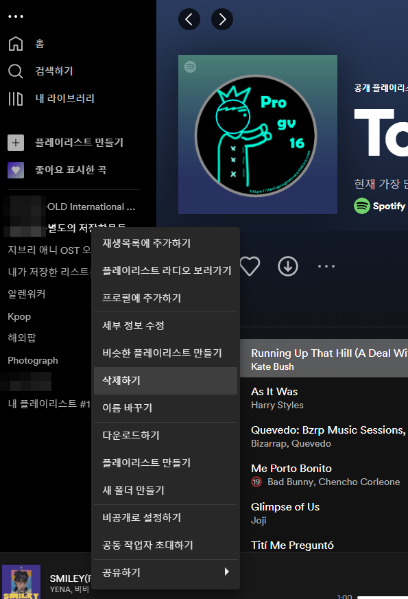 스포티파이의 플레이리스트는 PC버전 기준 왼쪽에 바로 보여서 본인이 어떤 플레이리스트를 만들고 어떤 곡을 넣었는지 바로 알 수 있게 해줍니다. 다른 스트리밍 서비스는 자세히 사용해 보지 않아서 알 수는 없지만 메뉴에 들어가서 플레이리스트를 구석구석 찾아야하는 경우도 있었습니다. 여기서 스포티파이의 장점을 더 느끼게 됩니다.