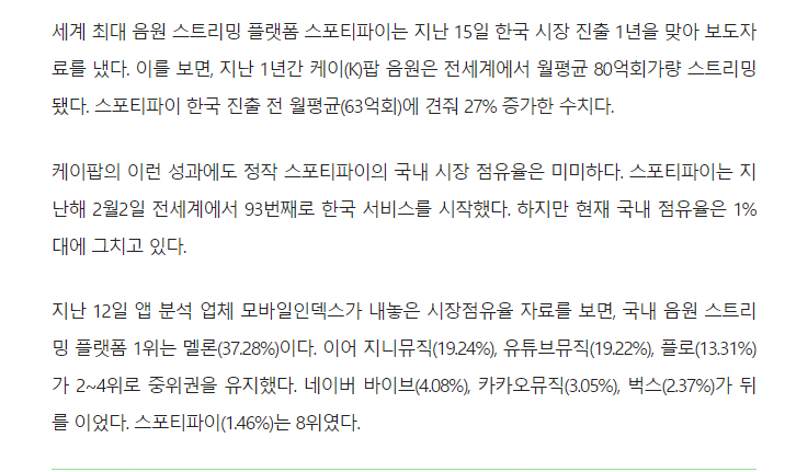 대한민국 內 스포티파이 점유율은 2021년 12월 기준 1% 내외입니다.