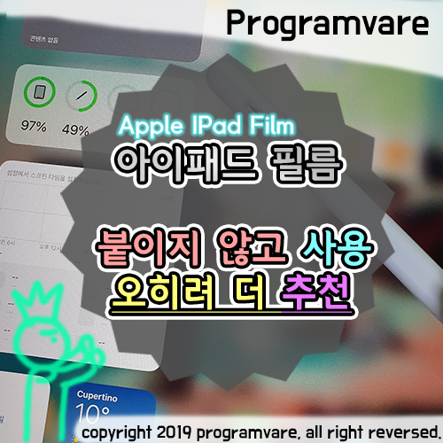 아이패드는 기본적으로 생패드(필름이나 케이스가 동봉되어 있지 않은 상태)로 판매됩니다. 생패드로는 쓰기에 겁이나고 액정을 더럽히기 싫다는 등 많은 이유를 포함하여 별로도 필름을 구매하여 붙입니다.