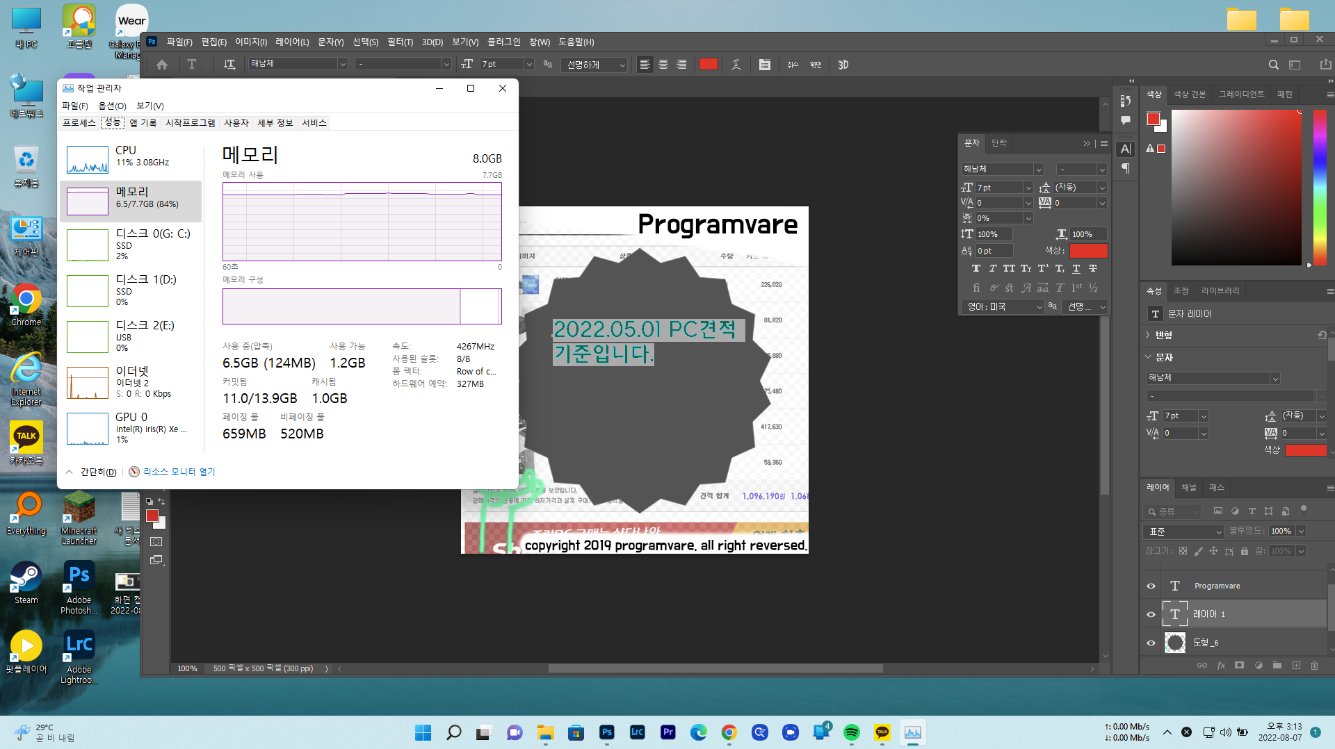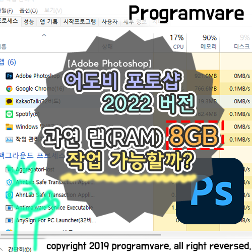 최종적으로 정리하자면 어도비 포토샵 2022년 버전은 8GB로도 가능하지만 원활한 작업을 위해서라면 16GB이상으로 업그레이드 하시거나 모든 창을 다 닫은 후 포토샵 프로그램만 단독으로 사용하시는 것을 추천드립니다.
