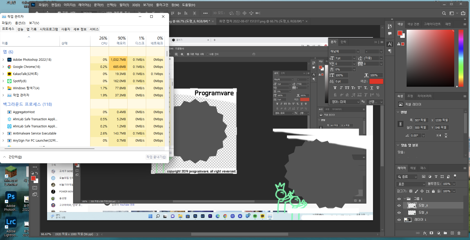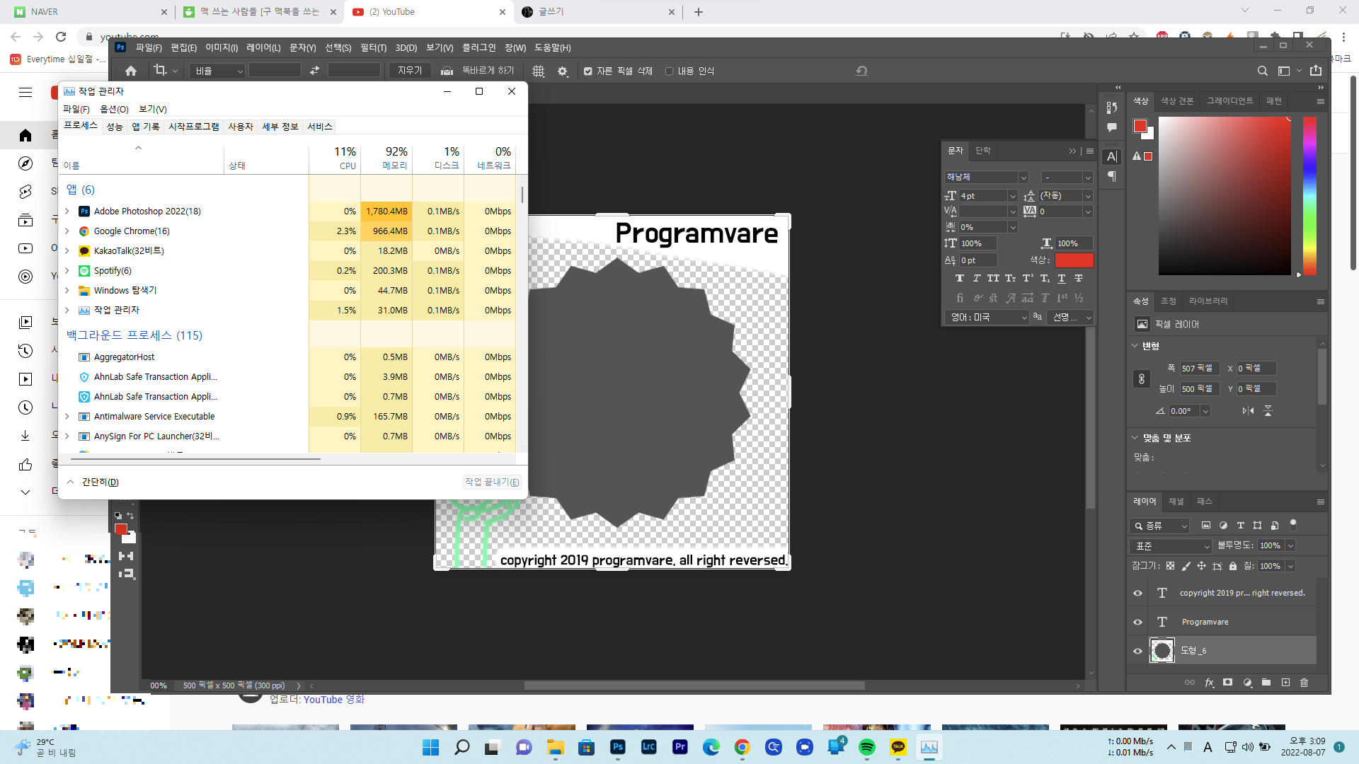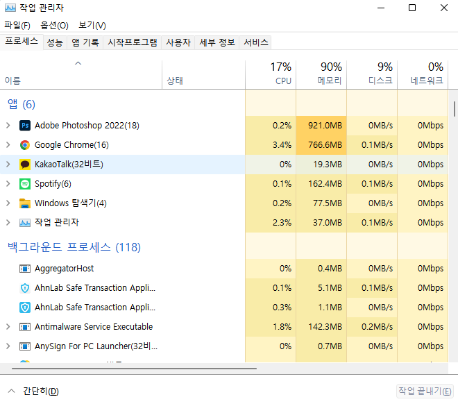 일단 포토샵을 열지 않은 상태이고 크롬 창 4개 (네이버, 네이버카페, 유튜브, 새 탭), 스포티파이, 카카오톡, PSD저장되어 있는 폴더만 열려있는 상태입니다.