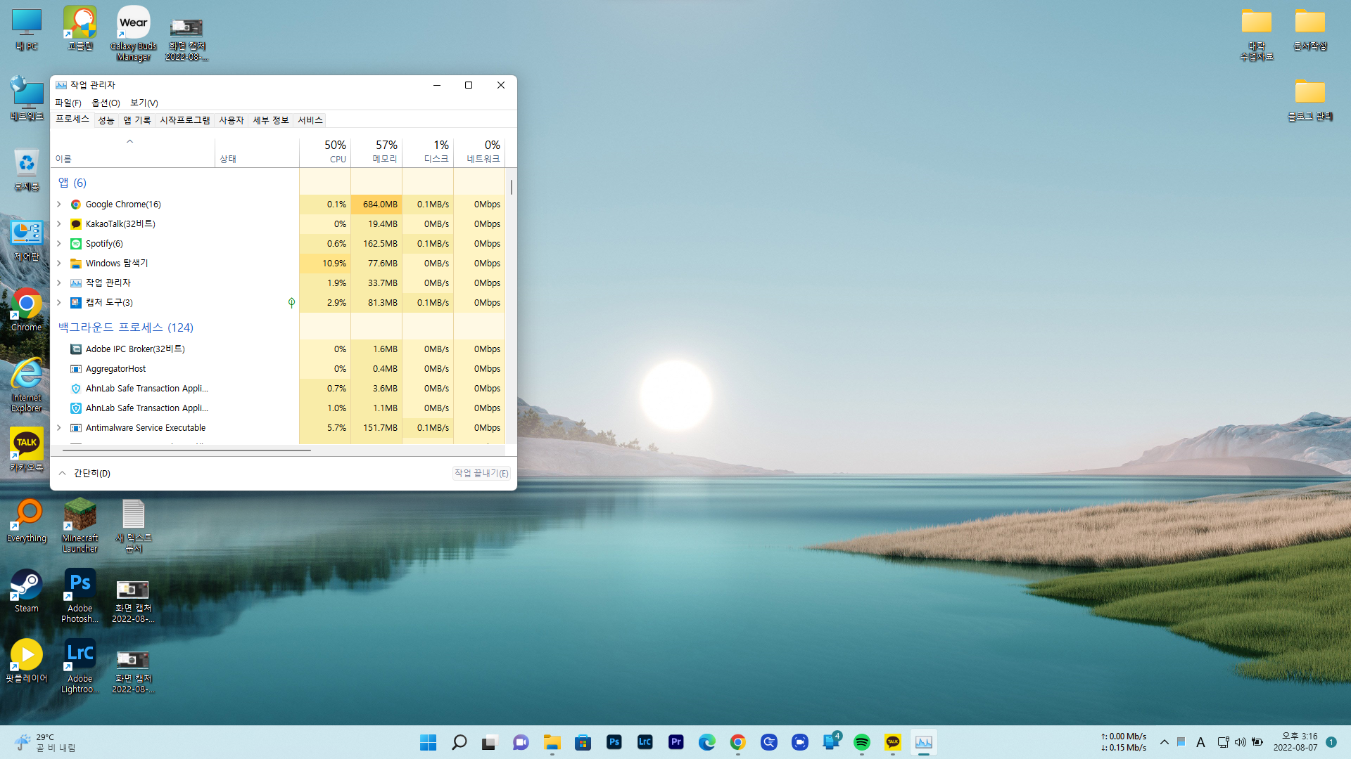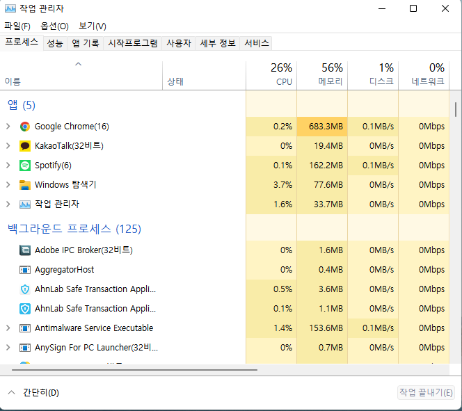 크롬 브라우저가 메모리를 많이 먹기는 하지만 전체 램 사용량은 50~56% 정도로 8GB 램 사용자를 기준으로 해서는 많이 사용하는 편은 아닙니다.