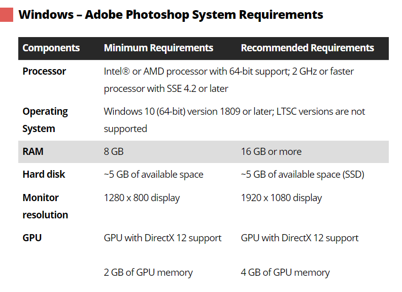 아래는 어도비 포토샵 Windows 사양표입니다.