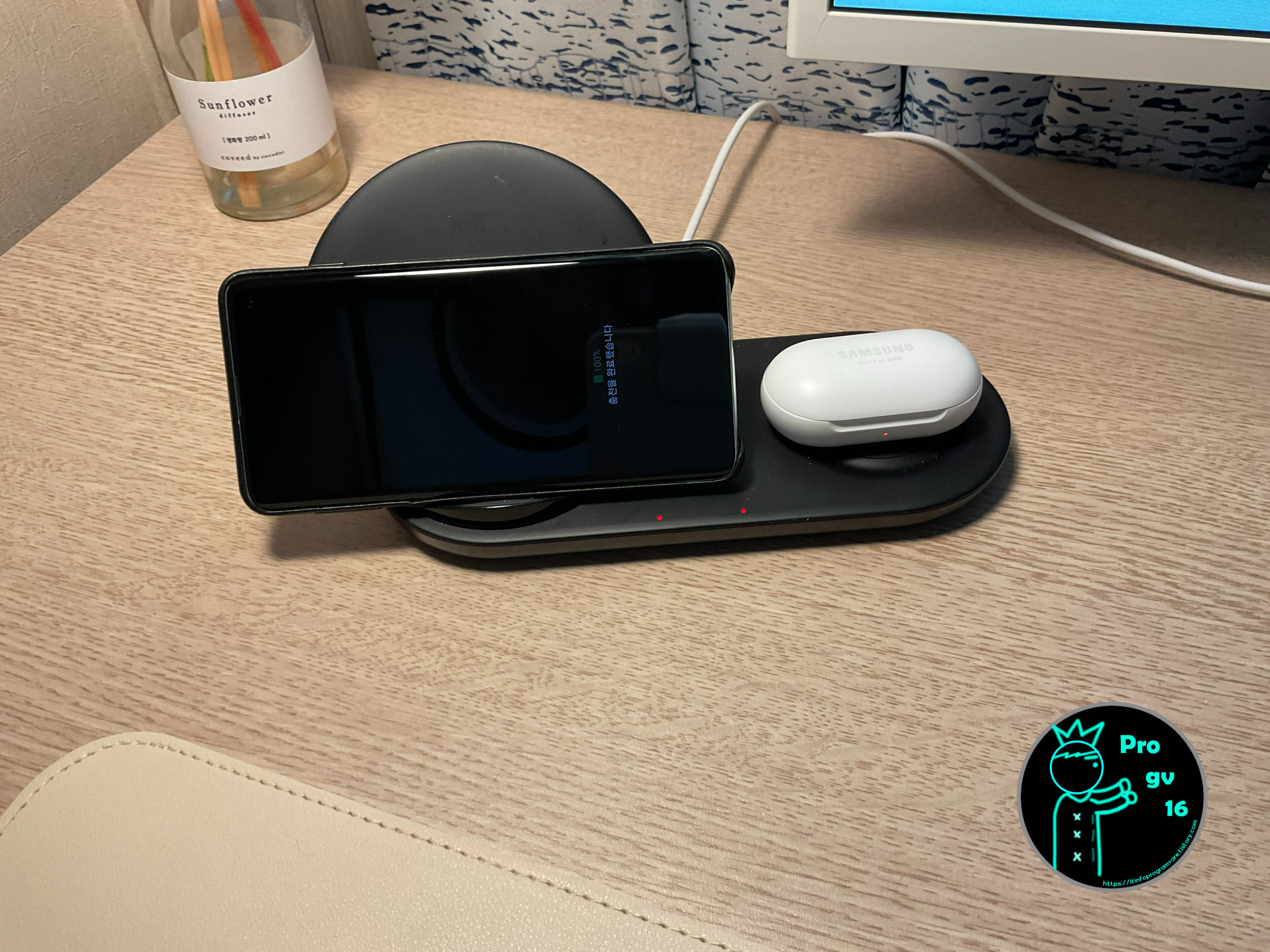 추가로 더한 개인적인 꿀팁, 사진같이 갤럭시 버즈까지 가지고 있다면 2개의 충전구 모두 활용할 수 있어서 동시에 충전 가능합니다. 덕분에 따로 충전하는 번거로움이 없어지며 편하고 빠른 충전이 가능하더라고요.