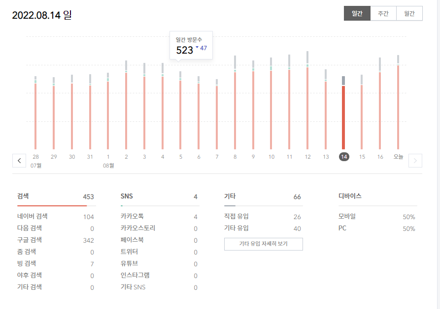 다행히 이미 네이버나 구글 검색에서 유입되는 방문수가 있었기 때문에 다른 사람들이 보기에는 유의미한 차이인가? 느끼실 수도 있을 것 같습니다.