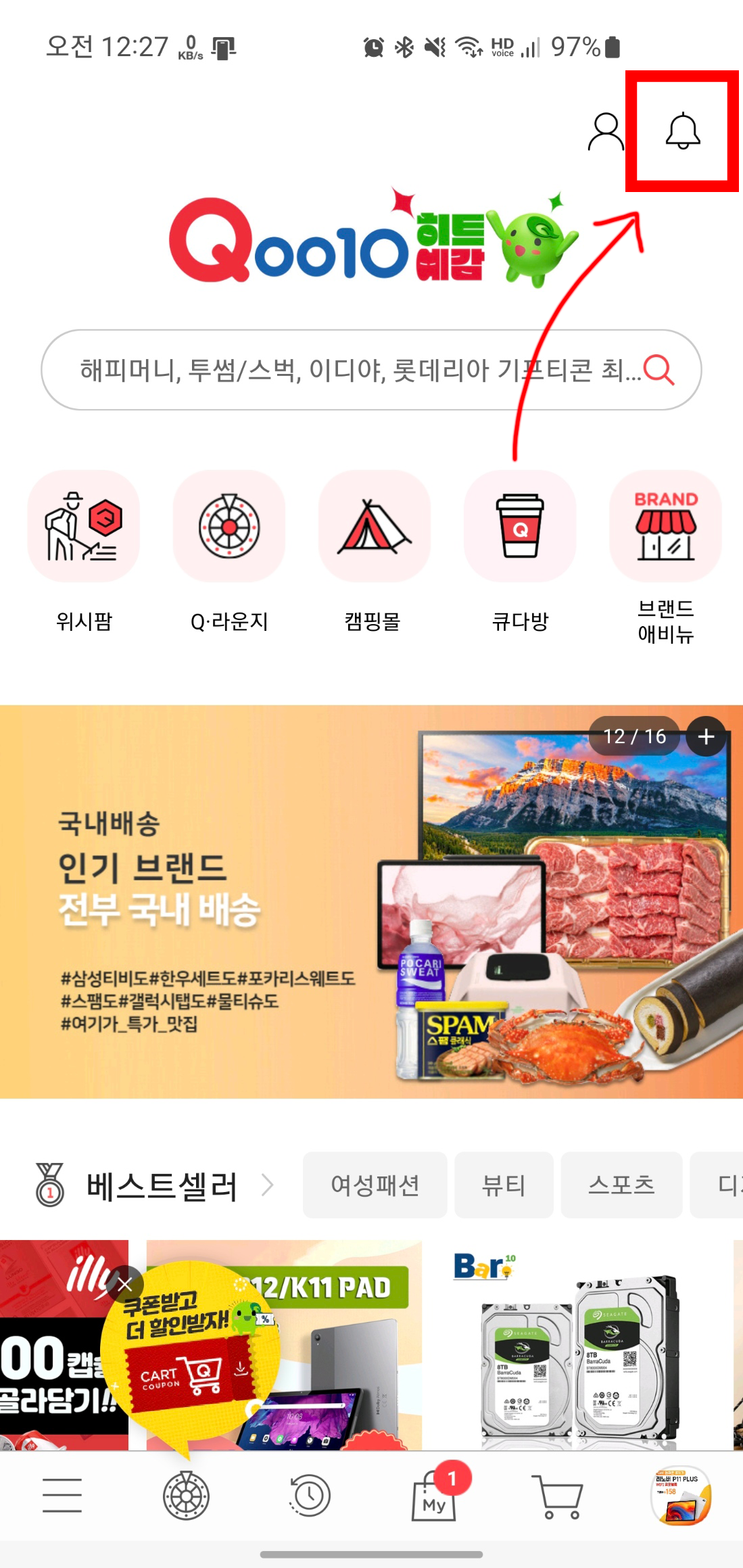 큐텐 앱에 접속하신 후 바로 뜨는 메인에서 오른쪽 상단의 종 모양을 클릭해줍니다.