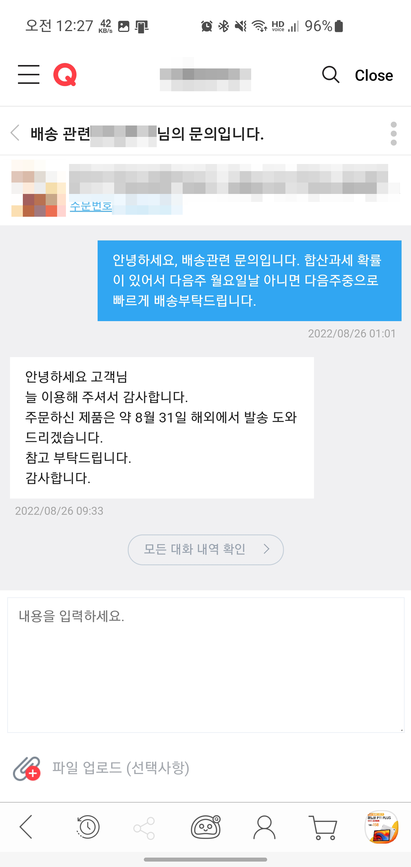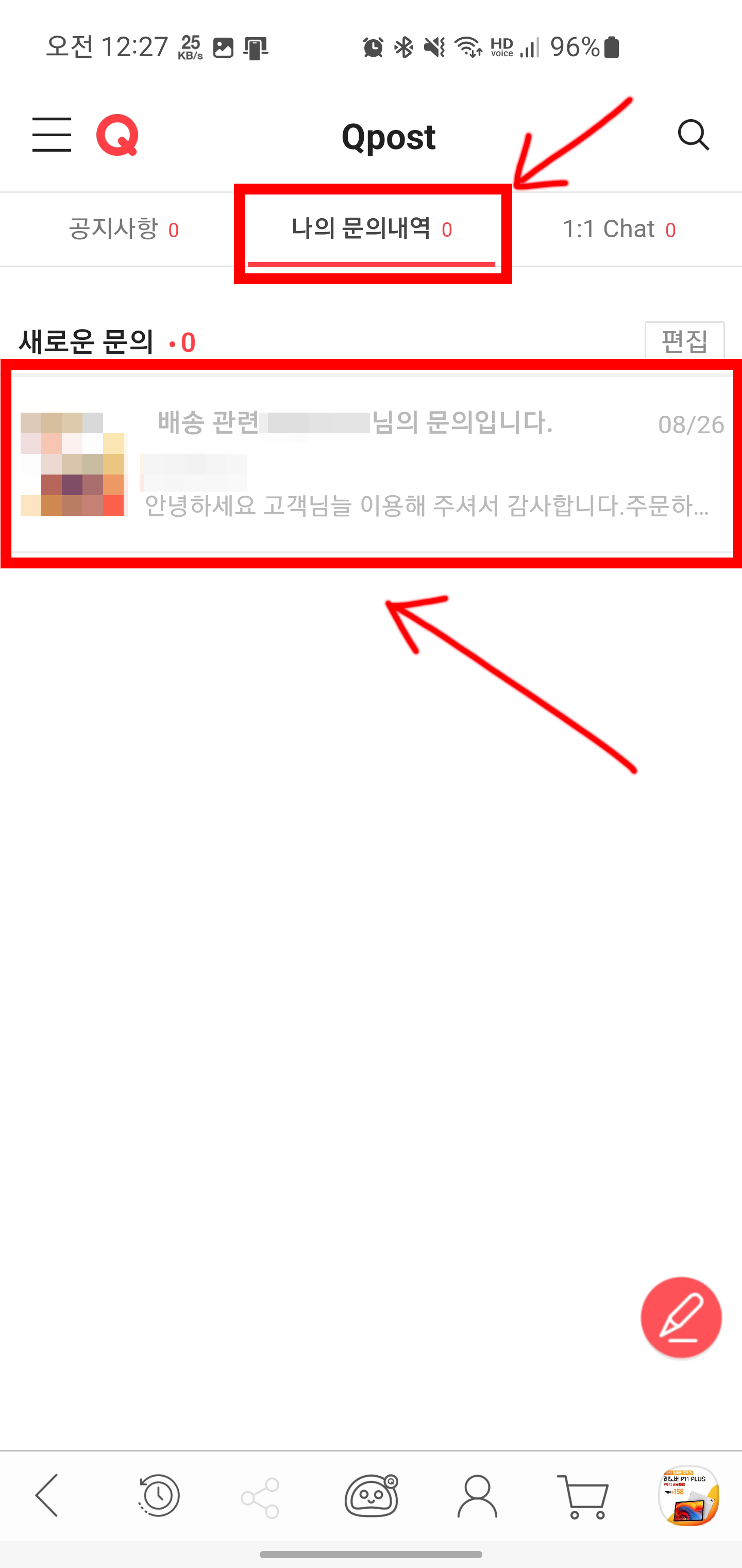 새로운 문의나 문의 받은 답변이 있다면 확인할 수 있으며 바로 클릭하면 판매자와 1대1로 문의한 대화내용들을 확인할 수 있습니다.